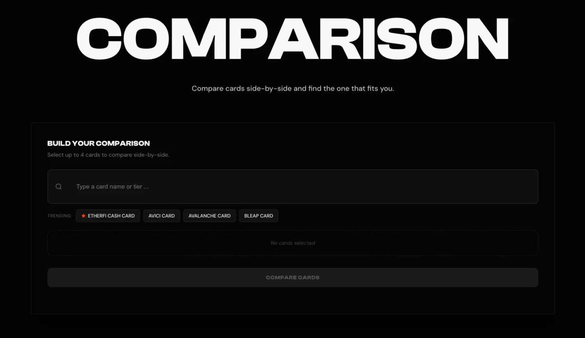 A crypto card decision usually comes down to trade-offs—rewards vs fees, simplicity vs flexibility, availability vs features. Todey’s comparison tool lets you select up to four cards and view their key attributes in a standardized layout.